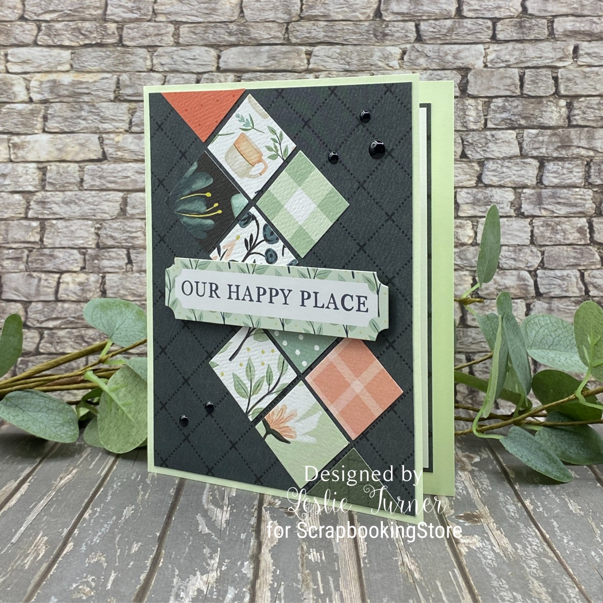Leslie created a side-folding A2 card featuring a diagonal panel made from ten one-inch squares punched from various patterned papers in this month’s collection. She layered a sentiment sticker from the sticker sheet on a scrap of white cardstock, trimmed it, and added it to the card front, finishing with a few black enamel dots for extra detail. The patterned papers in the kit made this design come together beautifully, and she kept the inside simple, adding just a die-cut piece from the upgrades to complete the card.