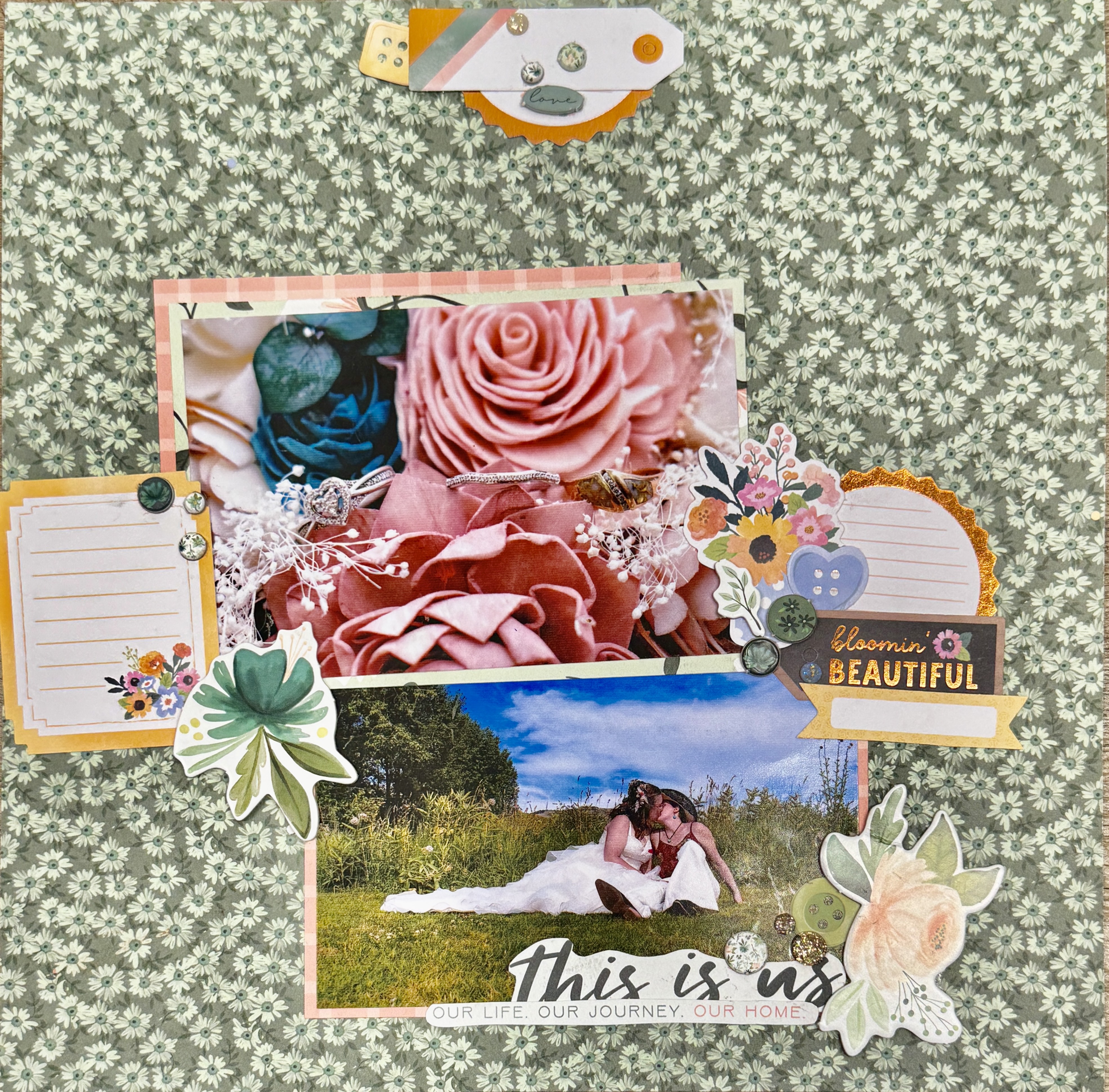 Meggy created a heartfelt scrapbook layout highlighting two cherished wedding moments, layering patterned papers to frame each photo beautifully. She used floral embellishments and button accents to draw the eye, adding texture and dimension throughout the page. The soft salmony-pink and green color palette brings a romantic, garden-inspired feel that perfectly complements the images. Meggy finished the layout with sentiment phrases, subtle sparkle details, and coordinating stickers, tying everything together into a blooming, love-filled keepsake.